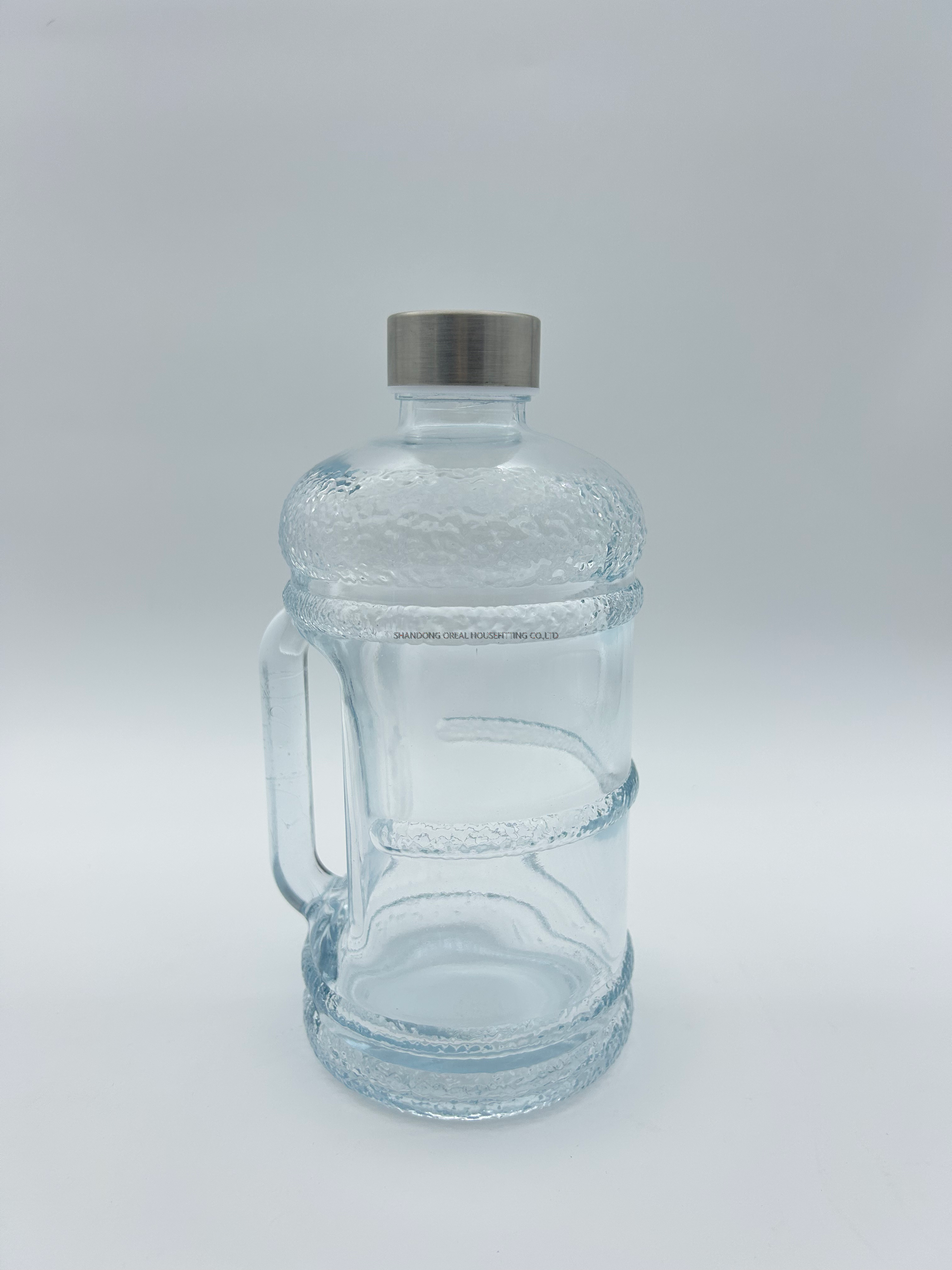 Clear glass water jug with handle, textured design, and screw-top opening. Durable, food-safe, and ideal for daily hydration, cold drinks, or home use
